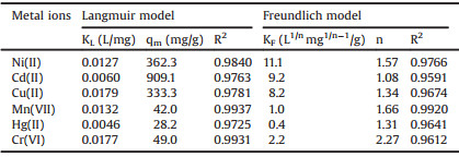 where KF (mg/g) was the Freundlich constant, and n was the heterogeneity factor. The values of KF and 1/n were determined from the intercept and slope of the linear plot of lnqe versus lnCe. Fig. 7a illustrates that the experimental data of metal ions were in good agreement with the Langmuir model while there were some differences between the Freundlich plots and the trend lines (Fig. 7b). The isotherm parameters and correlation coefficients are tabulated in Table 4. The maximum adsorption capacities obtained from Langmuir model were close to the experimental data, which indicated that the metal ions adsorption on the surface of CMCH was monolayer biosorption. The maximum adsorption capacity for Ni (Ⅱ), Cd (Ⅱ), Cu (Ⅱ), Mn (Ⅶ), Hg (Ⅱ) and Cr (Ⅵ) was 362.3, 909.1, 333.3, 42.0, 28.2, and 49.0 mg/g, respectively. Freundlich parameters (KF and n) indicated whether the nature of sorption was either favorable or unfavorable [8]. The values of n were greater than 1 indicating that the metal ions were favorable adsorbed by CMCH at high concentrations. A comparison of the maximum adsorption capacities of various metal ions onto different adsorbents is given in Table 5. It can be seen that the qm value varied considerably for different adsorbents. By contrast, CMCH exhibited a good capacity to adsorb Ni (Ⅱ), Cd (Ⅱ), Cu (Ⅱ), Mn (Ⅶ), Hg (Ⅱ) and Cr (Ⅵ) from aqueous solutions.