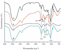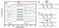 | Figure 4. FTIR spectra (a) of CMCH before and after adsorption of Cr (Ⅵ), Cu (Ⅱ), Ni (Ⅱ), Hg (Ⅱ), Cd (Ⅱ) and Mn (Ⅶ), the reasonable structure of CMCH-Metal ions complexes, pendant pattern (b) and bridge pattern (c) | |