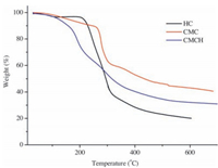 The thermal degradation of HC, CMC and CMCH were carried out in a flowing nitrogen atmosphere. As can be seen from Fig. 3, the TGA curves of pyrolysis process of HC, CMC and CMCH took place mainly in the temperature range of 208-319 ℃, 257-310 ℃ and 178-346 ℃, respectively. This weight loss was mainly due to the releasing of gas products such as CO, CO2, CH4, CH3COOH and HCOOH with some H2O. At 50% weight loss, the decomposition temperature of HC, CMC and CMCH was at 294, 316, and 434 ℃, respectively. These results indicated that the thermostability of CMC decreased in the process of thermal cross-linking.