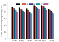 Fig. 8 shows the desorption efficiencies of CMCH on various metal ions after adsorption-desorption five cycles at 0.1 mol/L EDTA solution. It was found that metal ions adsorbed on CMCH were easily desorbed. The desorption efficiency of Ni (Ⅱ), Cd (Ⅱ), Cu (Ⅱ), Mn (Ⅶ), Hg (Ⅱ) and Cr (Ⅵ) reach about 95%, 93%, 90%, 99%, 99% and 89%, after the first cycle, respectively. The desorbed CMCH was still kept highly effective for the re-adsorption of metal ions after five repetitions of the adsorption-desorption cycles. This result indicated that CMCH was an effective and reusable bioadsorbent.