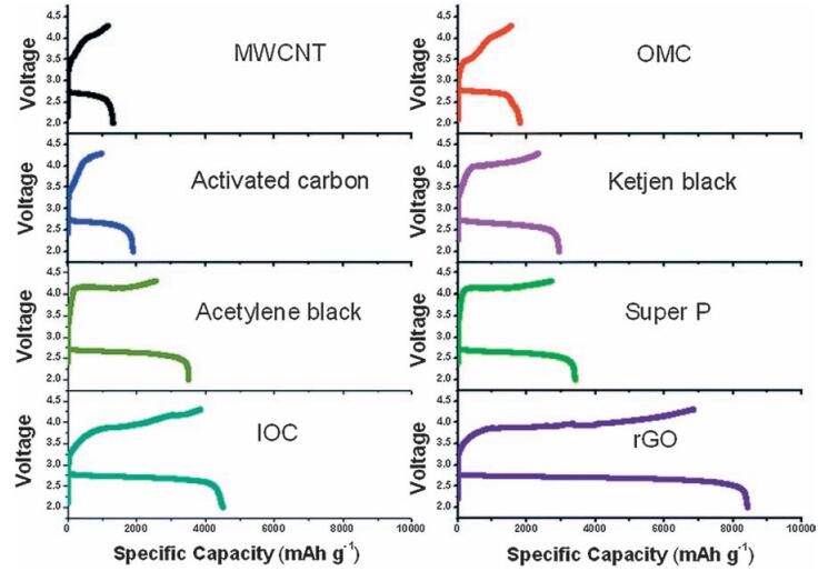 | Figure 2. Initial charge–discharge voltage profiles of Li-O2 batteries with various carbons cycled at a current of 0.05 mA (50 mA/gc). Reprinted from Ref. [48]. Copyright 2014 Royal Society of Chemistry. | |