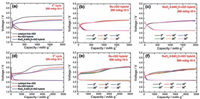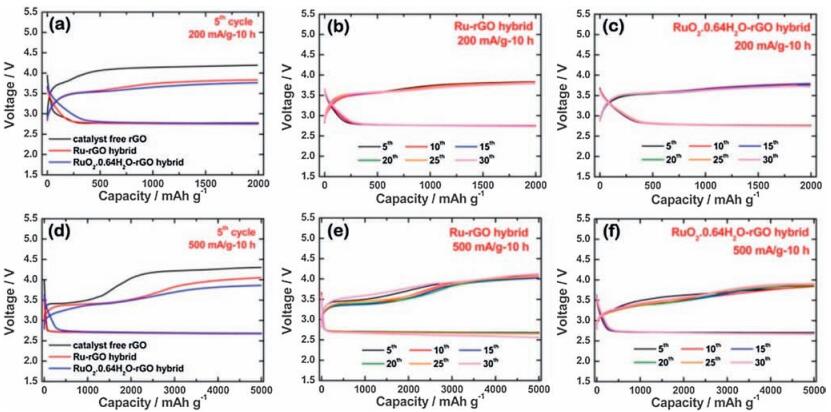 | Figure 3. Discharge–charge cycles of Li–air cells using rGO, Ru–rGO hybrid, and RuO2·0.64H2O–rGO hybrid under various specific capacity limits. (a–c) Current = 200 mA/g; time = 10 h; cycling capacity = 2000 mAh/g; voltage profiles of (a) fifth cycle and following cycles of (b) Ru–rGO hybrid and (c) RuO2·0.64H2O–rGO hybrid. (d–f) Current = 500 mA/g; time = 10 h; cycling capacity = 5000 mAh/g; voltage profiles of (d) fifth cycle and following cycles of (e) Ru–rGO hybrid and (f) RuO20.64H2O–rGO hybrid. The capacity was normalized by the total weight of oxygen electrodes (rGO or rGO + catalyst). Reprinted from Ref. [57]. Copyright 2013 American Chemical Society. | |