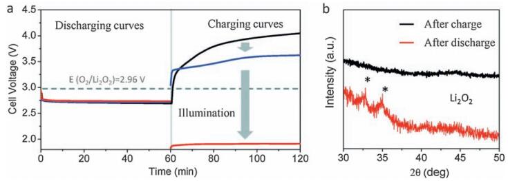 In addition to the common materials, there are also some unusual materials or additives may satisfy the requirement, they had been synthesized and utilized as effective catalyst for highperformance rechargeable non-aqueous Li-O2 battery [87–90], such as transition metal hydroxide [91], transition metal sulfides [92], electrolyte additive of iodine ions [93] and incorporating photo catalyst [94]. It should be noticed that there was a method to reduce the charge voltage by incorporating a photo catalyst [94] in electro-catalyst. To solve the problem of high over-potential they integrated the g-C3N4 photocatalyst and obtained a very low charge voltage at 1.9 V (Fig. 4), the g-C3N4 acted the dual roles of ORR catalyst and photocatalyst.