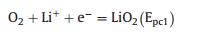 Experiments showed that superoxide radicals generated in the process of discharging in Li-O2 batteries [11, 15]. For example, Peng et al. [15] took 0.1 mol/L LiTFSA/CH3CN as the electrolyte and confirmed that LiO2 is the intermediate production by surface enhanced Raman spectroscopy. Laoire et al. [11] took 0.1 mol/L LiPF6/DMSO as the electrolyte and discovered three oxidation peaks by cyclic voltammetry (CVs). They kept the view that oxygen reduction reaction (ORR) of Li-O2 batteries could use the following formulas (Eqs. (3)–(6)):