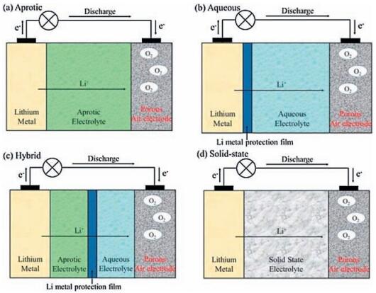 | Scheme 1. The four systems of Li-O2 batteries ((a) aprotic; (b) aqueous; (c) hybrid; (d) solid-state). Reprinted from Ref. [14]. Copyright 2014 American Chemical Society. | |