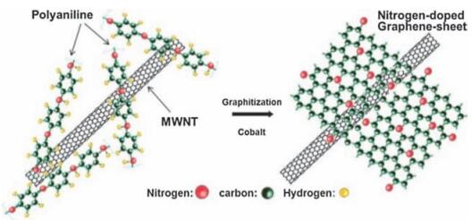 | Figure 4. The formation for nitrogen-doped graphene sheets derived from polyaniline and Co precursors using MWNTs as a template. Reprinted from Ref. [83]. Copyright 2012 American Chemical Society. | |