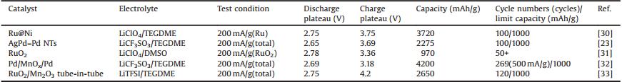 Table 1 The performances of Li-O2 batteries with various nobel metals catalysts. |