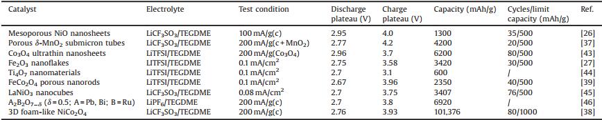 Table 2 Li-O2 batteries' performance with various transition metal oxides catalysts. |