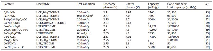 Table 4 Li-O2 battery performance of various nano-carbon hybrid materials catalysts. |