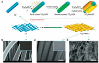| Figure 1. (a) Schematic representations for the design and preparation of the TiO2 NAs/CT; (b) Scanning electron microscope image and photograph (inset) of pristine—CT (scale bar, 10 μm); (c) SEM image and photograph (inset) of the obtained TiO2 NAs/CT cathode (scale bar, 10 μm); (d) enlarged image of (c) with 500-nm scale bars. Reprinted from Ref. [36]. Copyright 2015 Nature Publishing Group. | |