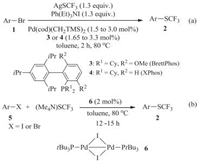 In 2015, Schoenebeck et al. reported the trifluoromethylthiolation of aryl iodides and bromides using a bench-stable and easy-to-recover dinuclear Pd(Ⅰ) catalyst 6 (Scheme 1b) [8]. Using 2 mol% of 6 along with an easily accessible SCF3 source, (Me4N) SCF3, diverse aryl iodides and bromides 5 were successfully trifluoromethylthiolated in toluene at 80 ℃. The air stability of the Pd(Ⅰ) catalyst provides a considerable practical advantage over more sensitive Pd(0)-catalyzed processes.