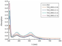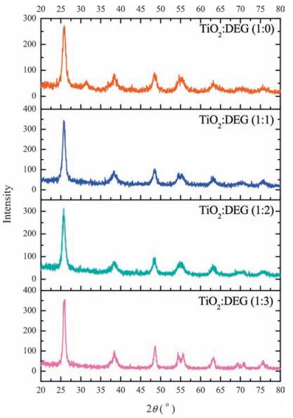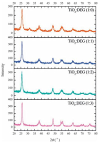 4.2. Preparation of TiO2 nanoparticlesTiO2 nanoparticles were prepared as follows: (1) 2 mL HNO3(65 wt%) was added into a 500 mL three 3-neck flask containing 250 mL distilled water in ice water bath. (2) The mixed solution of 40 mL butyl titanate and 10 mL isopropanol was slowly dropping into the 3-neck flask and then stirred for 1 h, and the aqueous solution slowly changed from milky to clear after stirring. (3) Aqueous ammonia was used to adjust the pH value of the mixture to 11, and the solution turned back to milky. (4) Different amounts of DEG were added to the milky solution (34 mL) in a 100 mL flask with stirring for 1 h, and then the hydrothermal precursor was obtained. The resultant solution was placed in an autoclave and aged at 220 ℃ for 16 h to obtain the uniform TiO2 nanoparticles. A hierarchical product was obtained after the hydrothermal reaction. The supernatant liquor was discarded and the bottom precipitates were washed and centrifuged with distilled water (three times) and ethanol (two times), respectively, to remove residual organic compounds on nanoparticles surface. The nanoparticles were then calcined at 500 ℃ for 3 h. The molar ratios of TiO2 to DEG were 1:0, 1:1, 1:2, and 1:3. The obtained samples were denoted as TiO2-DEG (1:x). And TiO2 nanoparticles prepared as above without the process 4 was denoted as TiO2 (DEG free).