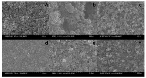 | Figure 2. SEM images (a) TiO2-DEG (1:2) nanoparticles; (b) TiO2 (DEG free) nanoparticles; (c) P25; (d) photoelectrode film based on TiO2-DEG (1:2) nanoparticles; (e) photoelectrode film based on TiO2 (DEG free) nanoparticles; (f) photoelectrode film based on P25. | |