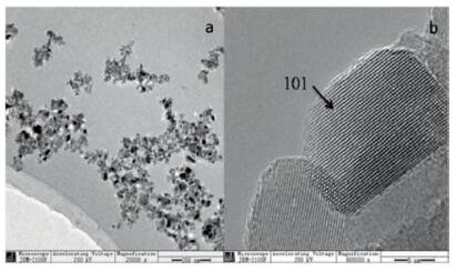 | Figure 3. HRTEM images of TiO2-DEG (1:2) nanoparticles (a) monodispersed TiO2 particles (b) lattice fringes of anatase. | |