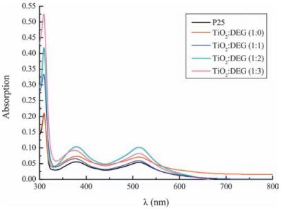 | Figure 4. UV–vis absorption spectra of the N719 dye desorbed from TiO2 film electrodes made from TiO2 synthesized by different additive amounts of DEG. | |