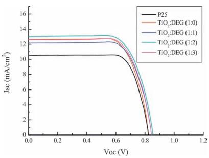 | Figure 5. J-V curves for DSSCs fabricated from different TiO2 photoelectrodes. | |