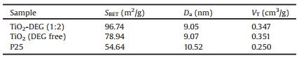 Table 1 Specific surface area (SBET), average pore size (Da) and total pore volume (VT) of the different TiO2 determined from gas adsorption analysis. |