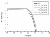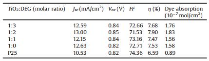 It can be seen from Table 2 that the solar cell based on TiO2-DEG photoelectrodes exhibited better performance than those involving the TiO2 (DEG free) and P25 and the best performance was realized for the TiO2-DEG cell, of which the photoelectrode was fabricated with the TiO2 nanoparticles prepared by using the 1:2 molar ratio of TiO2 to DEG. The η value increased while the DEG molar ratio was increased from 1:3 to 1:2, and declined at 1:1. However, these values were all greater than the cells based on P25. These results confirmed the influence of DEG on the properties of synthesized TiO2 photoelectrodes and the performance of DSSCs. A combination of the results obtained above suggested that the increase of the surface area and the uniform porous photoelectrode films could enhance the ability of dye adsorption and lead to higher photocurrent for DSSCs, which are important for the optimization of the performance of DSSCs.