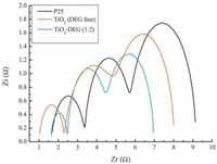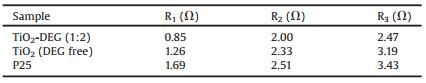 Fig. 7 shows the Nyquist plots obtained by electrical impedance spectroscopy (EIS), and the according values of resistances are shown in Table 3. In general, three semicircles were obtained from the Nyquist plot. The semicircles are assigned to electrochemical reaction at the Pt counter electrode/electrolyte or FTO/TiO2 (R1), charge transfer reaction at TiO2/dye/electrolyte (R2) and the Nernst diffusion of the electrolyte (R3) [28, 29]. In the high frequency region (103–105 Hz), and a relatively smaller semicircle was observed for TiO2-DEG photoelectrode, which indicated that a lower resistance (0.85Ω) was obtained for the TiO2-DEG photoelectrode than that for the other two (1.26Ω and 1.69Ω). The middle semicircle (1–103 Hz) indicates the charge transfer resistance in the photoelectrode [30]. The smaller value (2.00Ω) for the TiO2-DEG photoelectrode suggested that TiO2-DEG may contribute to the reduction of charge transfer resistance at the TiO2/dye/electrolyte interface [31]. Similar behaviors are also observed in the low-frequency region (0.1–1 Hz), implying the facile diffusion of electrolyte through TiO2-DEG photoelectrode. Eventually, the impedance spectroscopy studies suggested the photoelectrode based on the prepared TiO2-DEG material would allow fast electron transport and diffusion as expected, and also a well diffusion of electrolyte, which may arise from the smooth and uniform nanofilms.