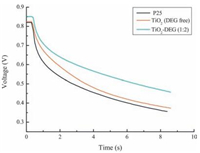 2.4. Open-circuit voltage decay (OCVD) measurementOCVD technique has been employed as a convincing method to provide valuable information of the electron recombination velocity in DSSCs [24, 25]. The simulated solar light illuminated at DSSCs, resulting in a steady-state voltage. It indicated that electron injection and electron recombination reached equilibrium under the simulated solar light, and then the decay of photovoltage was detected by the potentiost after the removal of the light illumination. The rate of the photovoltage decay reflected the decrease of the electron concentration which is mainly caused by the charge recombination [26]. Fig. 6 shows the OCVD decay curves of the DSSCs based on the TiO2-DEG (1:2), TiO2 (DEG free), and P25 photoelectrodes. It is observed that the OCVD response of the DSSC based on the TiO2-DEG was much slower than those of the cells fabricated using TiO2 (DEG free) and P25, especially in the short time domain (within 8 s). Slower decay means higher electron concentration, less charge recombination, and longer electron lifetime in DSSCs. The slower OCVD for the cell fabricated with TiO2-DEG nanoparticles can be well explained based on the previous results, that the TiO2-DEG nanoparticles have more dye molecules absorbed, and more photo-generated electrons in the nanofilms.