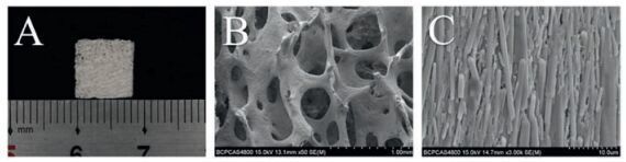 2. Results and discussion 2.1. Characterization of CACB scaffoldsCACB was white and porous scaffold in gross view (Fig. 1A). To capture more details about CACB, we used scanning electric microscopy (SEM). Well-interconnected macro-pores range about 300-700 mm in size were shown in SEM images (Fig. 1B). The basic elements of the CACB were hydroxyapatite (HA) crystals that are 400-600 nm in width and 5-15 mm in length (Fig. 1C). Previous studies showed that pore sizes >300 mm and porosity ranging from 70% to 80% are optimal for enhanced vascularization and osteogenesis, due to appropriate exchange and supply of oxygen and nutrients [12, 13]; the microstructure of CACB had been proved to be benefit for mesenchymal stromal cells such as ADSCs spreading and osteogenic differentiation [7]. Thus, the structure of CACB could favor the activity of BMSCs in vitro and bone regeneration in vivo.