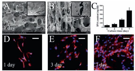 | Figure 2. The bioactivity of BMSCs on CACB scaffolds. (A, B) SEM images of BMSCs adhesion and morphologies on CACB scaffolds after 1 and 7 days of incubation. (C) DNA content of BMSCs seeded on CACB. (D, E, F) CLSM images of BMSCs on CACB observed. (Scale bar = 50 μm). | |