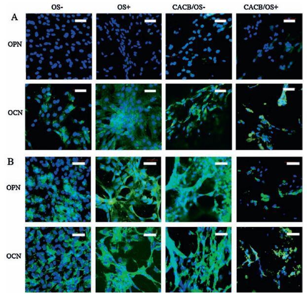 4.5. Immunofluorescence staining of OPN and OCNThe cells were cultured in 4 different culture conditions in this experiment: the CACB/OS-group, BMSCs seeded in CACB and cultured in common medium; the CACB/OS+ group, BMSCs seeded in CACB and cultured in osteoinductive medium (OS, common medium containing 10 nmol/L dexamethasone, 20 mmol/L β-glycerophosphate, 0.05 mmol/L ascorbic acid); the OS-group, cells cultured with common medium; and the OS+ group, cells cultured with osteoinductive medium. At 7th and 14th day, after fixed with 4% paraformaldehyde, the cells were permeabilized with 0.1% Triton X-100/phosphate-buffered saline for 5 min, blocked with 3% bovine serum albumin, and then incubated with a 1:500 dilution of the primary antibodies to osteopontin (OPN; custom made from Abcam, Inc.) or osteocalcin (OCN; Abcam, Inc.) overnight at 4 ℃. Afterward, the cells were incubated with a 1:250 dilution of the secondary antibody (FITC-conjugated Affinipure goat anti-mouse IgG; Abcam, Inc.). Finally, cell nuclei were stained with DAPI. The staining intensities of OCN, and OPN were observed using CLSM.