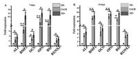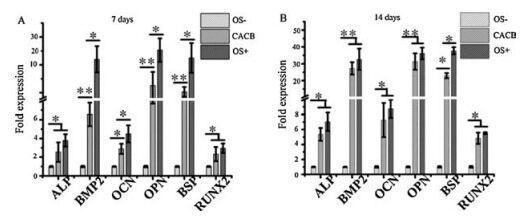 | Figure 4. Gene expression profiles of ALP, BMP2, OPN, OCN, BSP and RUNX2 analyzed by RT-qPCR after 7 (A) and 14 days (B) of cultivation. Cells cultured in common medium (OS-) were used as the control group. *P < 0.05 and ** P < 0.01. | |