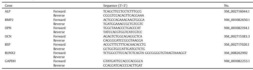 4.6. Real-time quantitative PCR analysisThree groups were included in this experiment: The CACB group, BMSCs seeded in CACB and cultured in common medium; the OS-group, cells cultured with common medium; and the OS+ group, cells cultured with osteoinductive medium. At 7th and 14th day, cells were lysed with Trizol Reagent (Ambion) and total RNA was extracted. The ReverTra Ace qPCR RT Master Mix (Toyobo Co., Ltd.) was used to synthesize first-strand cDNA. Real-time quantitative polymerase chain reaction (RT-qPCR) using Fast-Start Universal SYBY Green Master (Rox; Roche Ltd.) was performed with a 7500 Real-Time PCR System (Life Technologies, Inc.). Relative quantification was carried out using the 2-△△t method. Three separate experiments were performed. The primer sequences of osteogenic genes including alkaline phosphatase (ALP), bone Morphogenetic Protein 2 (BMP2), OPN, OCN, bone sialoprotein (BSP) and runt-related transcription factor 2 (RUNX2) are listed in Table 1.