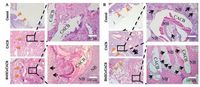 | Figure 5. Bone defect repair in rabbit mandibles defect models after implantation of auto-BMSCs/CACB. (A) Histological analysis of new bone formation by hematoxylin and eosin (H & E) staining at 4 weeks. (B) Histological analysis of new bone formation and growth of blood vessels by H & E staining at 12 weeks. (NB, nascent bone, BV, blood vessels; Orange arrow denote boundary of bone defects; Black arrows denote new blood vessels). | |