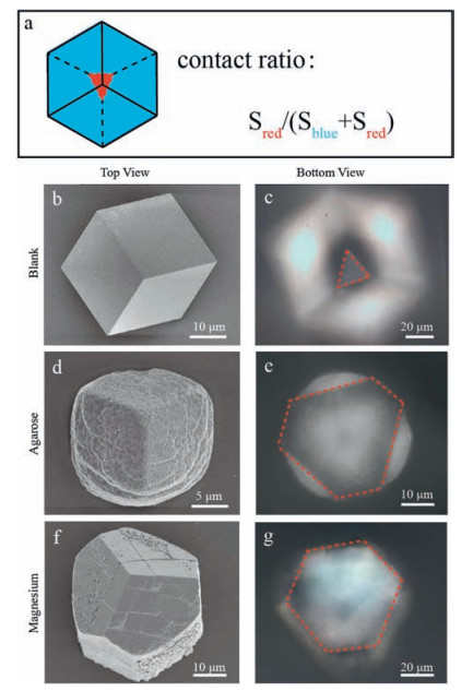 | Figure 1. (a) Schematic representation of a calcite crystal nucleating on a substrate with a contact face (red). The contact ratio is defined as the contact area to the projected area (red and blue) of the whole crystal, (b, d and f) Scanning electron microscopy (SEM) images of top view of calcite single crystals grown in 5 mmol/L CaCl2 with no additive, 1 w/v% agarose gel and 5 mmol/L MgCl2 respectively, (c, e and g) Optical microscopy (OM) images of bottom view of the calcite single crystals contacting with glass slides grown in 5 mM CaCl2 with no additive, 1 w/v% agarose gel and 5 mmol/L MgCl2 respectively. | |