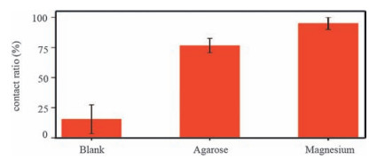| Figure 2. The contact ratio of the calcite single crystals grown on glass slides in solution (5 mmol/L CaCl2), agarose gel (1 w/v%; 5 mmol/L CaCl2) and solution (5 mmol/L CaCl2; 5 mmol/L MgCl2). 50 crystals from each experiment were measured. | |