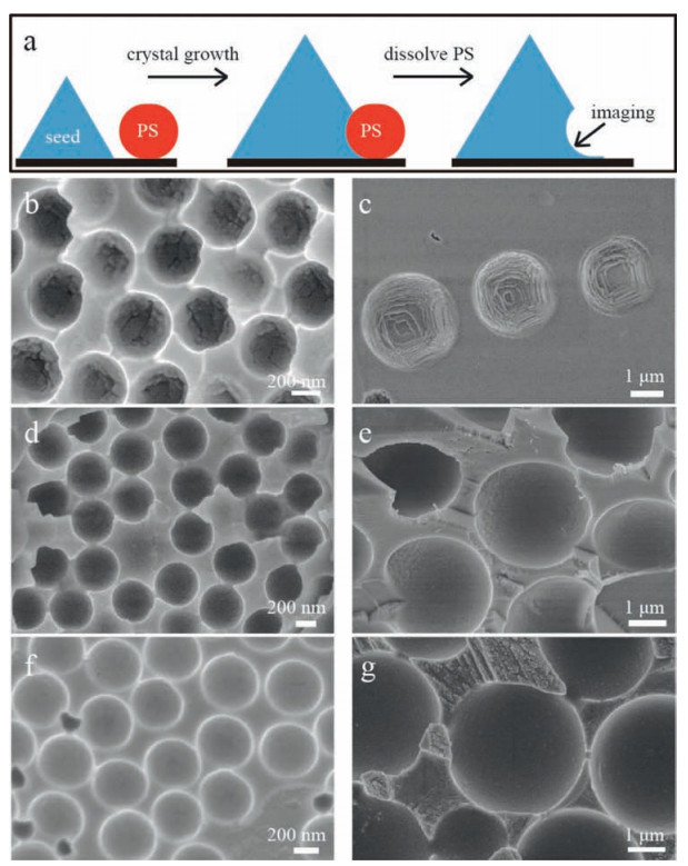 | Figure 3. (a) A schematic representation of the method to image the interface between calcite crystals and PS spheres, (b, d, and f) SEM images of the interface morphologies between calcite single crystals and 500 nm PS spheres with no additive, 1 w/v% agarose, and 5 mmol/L MgCl2, respectively, (c, e, and g) SEM images of the interface morphologies between calcite single crystals and 3 mm PS spheres with no additive, 1 w/v% agarose, and 5 mmol/L MgCl2, respectively. | |