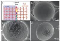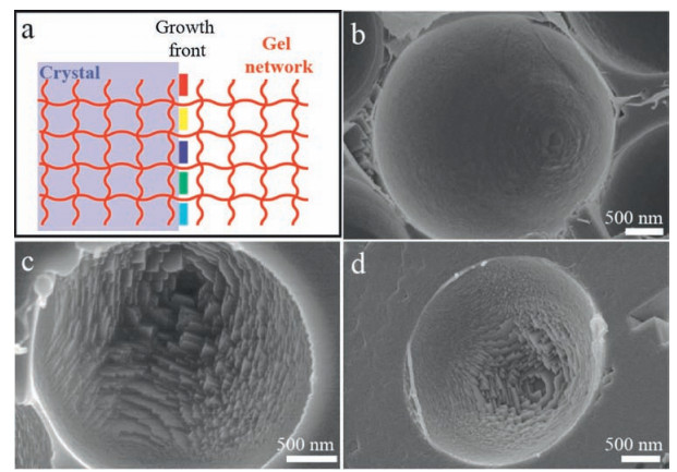 | Figure 4. (a) Schematic representation of the gel effect, (b) SEM images of the interface morphology between calcite single crystal and PS sphere with 1 w/v% agarose, (c) with 0.1 w/v% agarose, and (d) with 1 w/v% agarose (Ⅸ). | |