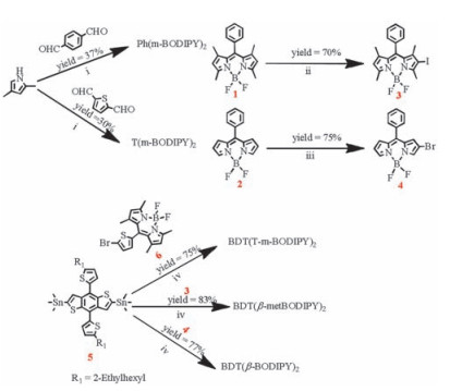 | Figure 5. Synthesis routines of the dimers. Reaction conditions: (ⅰ) TFA, DDQ, (iPr)2EtN, BF3-Et2O, N2, CH2Cl2, yield: 37% and 30% for Ph (m-BODIPY)2 and T (mBODIPY)2, respectively; (ⅱ) NIS, CH2Cl2, yield: 70%; (ⅲ) Br2, CH2Cl2, yield: 75%; (ⅳ) Pd (PPh3)4, N2, 120 ℃, toluene, 12 h, yield: 75%, 83% and 77% for BDT (T-m-BODIPY)2, BDT (β-metBODIPY)2 and BDT (β-BODIPY)2, respectively. | |