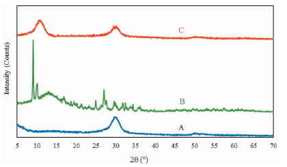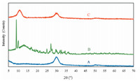 | Figure 2. XRD patterns of: (A) MWCNT-APIB; (B) ZnPOM and (C) [ZnPOM@APIBMWCNT] composite. | |