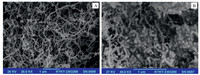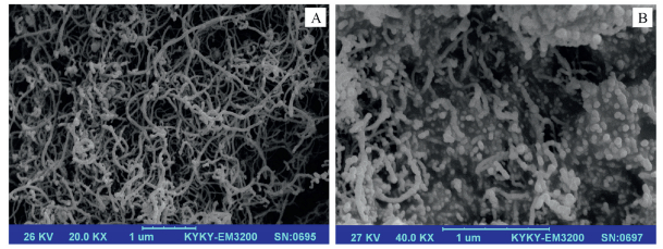 | Figure 3. Scanning electron micrographs of: (A) MWCNT-APIB and (B) [ZnPOM@APIB-MWCNT]. | |