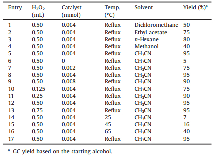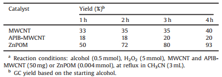 The catalytic activity of the supported ZnPOM cluster was tested in the oxidation of benzyl alcohol to benzaldehyde with hydrogen peroxide. The reactions were continued until no further progress was observed. In order to choose the reaction media, various organic solvents were examined in the oxidation of benzyl alcohol. Among dichloromethane, acetonitrile, ethyl acetate, methanol and n-hexane, acetonitrile was selected as reaction media because the highest aldehyde yield was observed (Table 1, entries 1-5). The amounts of catalyst and H2O2 were also optimized and the higher yield was obtained using 0.004 mmol of catalyst and 5 mmol of H2O2 (Table 1, entries 6-9 and entries 10- 13). The data of optimized of temperature was shown in Table 1 (entries 14-17). The time courses of ZnPOM, APIB-MWCN and MWCN under these reaction conditions are shown in Table 2. Under the optimized conditions, oxidation of different alcohols was investigated (Table 3). To study the catalytic activity of the system, alcohol (0.5 mmol) and [ZnPOM@APIB-MWCNT] (50 mg, 0.004 mmol) in 3 mL CH3CN were introduced into a 25 mL roundbottom flask equipped with a magnetic stirrer (400 rpm). H2O2 (5 mmol, 30%) was added to this mixture and refluxed. The progress of the reactions was monitored by GC. At the end of the reaction, the catalyst was filtered and washed with Et2O (20 mL). The pure product was obtained after chromatography of organic layer on a short column of silica gel.