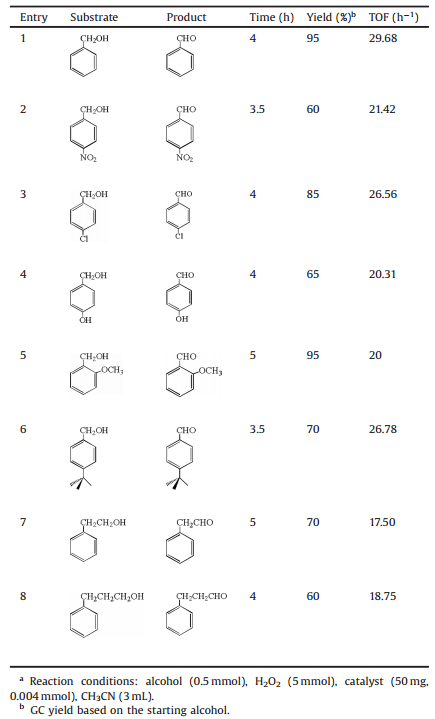 In the presence of [ZnPOM@APIB-MWCNT] alcohols were converted to their corresponding aldehydes with 100% selectivity (Scheme 2). The electronic nature of the substituent exhibited little effect on the reaction process. It was assumed that reoxidation of the catalyst and not the dehydrogenation (α-H) step was ratelimiting [21]. The oxidation of the benzyl alcohol afforded benzaldehyde with an excellent yield of 95%. Substituted benzyl alcohol with donating and drawing groups such as NO2, Cl, OH, OMe, and t-Bu gave the desired products (Table 3, entries 2-6). Oxidation of 4-methoxy benzyl alcohol was oxidized to its corresponding aldehyde in excellent yield (95%). For 4-tert-butyl benzyl alcohol, the desired aldehyde was obtained in the yield of 70%. In the case of alcohols with electron-drawing substituents, 4-nitrobenzyl alcohol, 4-chlorobenzyl alcohol, 4-hydroxybenzyl alcohol were oxidized to the corresponding aldehydes with yields of 60%-85%. Oxidation of 1, 2-phenylethanol and 1, 2-phenylpropanol were oxidized to 1, 2-phenylethanal and 1, 2-phenylpropanal with yield of 70% and 60% respectively.