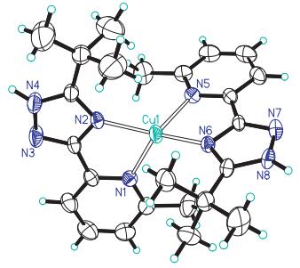 4.2. Synthesis of [Cu(bmptzH)2](ClO4) (1) 4.2.1. Method 1A CH2Cl2 solution of [Cu(PPh3)2(CH3CN)2](ClO4) (63.9 mg, 0.083 mmol) and bmptzH (18.0 mg, 0.083 mmol) was stirred at room temperature for 3 h to give a yellow solution. The solvent was then removed at reduced pressure. The resulting residue was again dissolved in CH2Cl2, and slow diffusion of a mixture of methanol– petroleum ether (1:10, v/v) into the above solution yielded yellow crystals of 1 (20.5 mg, 0.034 mmol, 41% based on [Cu(PPh3)2(CH3CN)2](ClO4)). 1H NMR (CD2Cl2, 400 MHz): δ 12.35 (s, 2H), 8.19 (d, 2H, J=8 Hz), 7.90 (t, 2H, J=8 Hz), 7.39 (d, 2H, J=8 Hz), 2.31 (s, 6H), 1.26 (s, 18H). Selected IR (KBr, cm-1): 1108 s (ClO4-). Anal. calcd. for C24H32ClCuN8O4: C, 48.40; H, 5.42; N, 18.81. Found: C, 48.44; H, 5.40; N, 18.83.