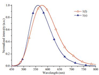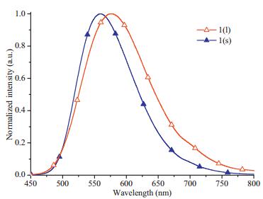 Complex 1 gives a broad single emission band at ambient temperature in degassed CH2Cl2 solution (Fig. 3), peaking at 575 nm with the quantum yield of 0.020 and the emission lifetime of 8.7 µs. The emission intensity of 1 is drastically quenched by the presence of oxygen in aerated CH2Cl2 solution. This, together with the emission lifetime of several microseconds, suggests that the emission may be phosphorescent in origin. Thus, it is believed that the solution emission of 1 may originate from the metal-to-ligand charge-transfer (3MLCT, Cu(3d)→bmptzH) transition, probably mixed with some intra-ligand (3IL) charge-transfer character inside bmptzH. The solid-state emission of 1 was also investigated at room temperature using powder sample (Fig. 3). Complex 1 is highly emissive in the solid state at room temperature, and emits a strong emission with the maximum at 560 nm, the quantum yield of 0.784 and the emission lifetime of 17.1 µs. The solid-state emission of 1 has a hypsochromic shift of 15 nm compared to its solution emission, as a result of the rigid medium. Such an emission behavior is often observed in luminescent Cu(Ⅰ) complexes [7, 9, 11, 12].