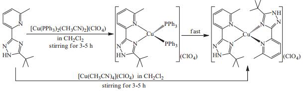 Cu(Ⅰ) complexes with two diimine chelates and one diimine plus one bis-phosphine mixed-ligands are one of the most extensively studied types [5, 11, 12]. However, this type of tetrahedral Cu(Ⅰ) complexes generally emit weak and short-lived emissions in solution, because their excited states readily suffer the Jahn–Teller based geometric distortion, which results in a more flattened conformation and thus facilitates relaxation back to the ground state via non-radiative pathways [5]. It is known that structural modification of the diimine ligands such as 1,10-phenanthroline is an effective approach for tuning luminescence properties of Cu(Ⅰ) complexes. On introducing various substituents displaying different steric and conformational effects on the Cu(Ⅰ) core, the steric hindrance is increased and the Jahn–Teller based distortion is more difficult to occur and thus luminescence properties are improved. Herein, we report the synthesis, structure and photophysical properties of a new Cu(Ⅰ) bis-{5-tert-butyl-3-(6-methyl-2-pyridyl)-1H-1,2,4-triazole} complex.