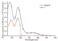 | Figure 2. Absorption spectra of bmptzH and complex 1 in CH2Cl2 solution. | |