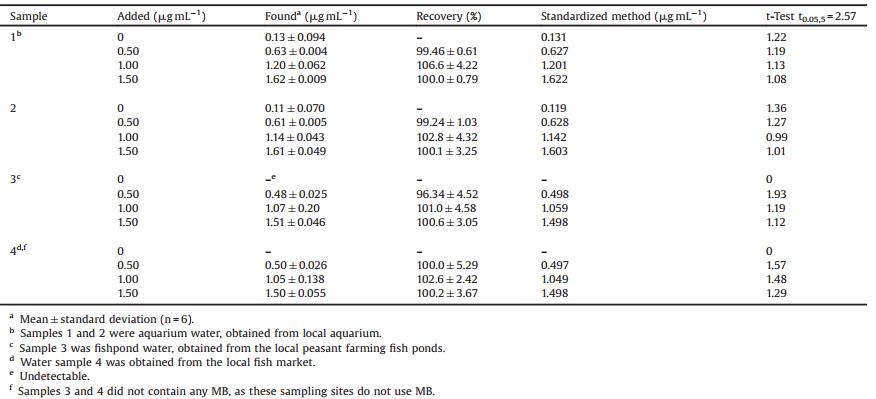 Table 3 Results of determination of MB in water samples (n = 6). |
