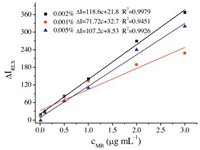 4. Analytical applications 4.1. Calibration curve and detection limitUnder the optimal conditions, the RLS intensity of the solution was measured at 370.0 nm and the results are shown in Fig. 10. The RLS intensity increased with the increase in MB concentration. There was a good linear relationship between the △IRLS and the concentration of MB over the range of 0.01-3.0 μg mL-1. The regression equation was △IRLS = 118.6c + 21.83 (c, μg mL-1) with R2 of 0.9979. The limit of detection (LOD) was as low as 4.36 ng mL-1.
