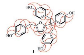 | Fig. 2. Main 1H-1H COSY (thick lines) and bond HMBC correlations (red arrows, from 1H to 13C) of 1. | |
