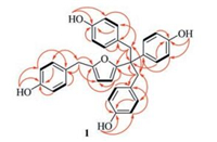 Interestingly and notably, the 1H NMR spectrum of 1 in acetone-d6 showed a singlet for H2-7', an overlapped AB coupling system for H2-7''/7''', and vicinal coupling doublets for aromatic protons of the p-hydroxybenzyl (Table 1 and Figs. S7 and S8 in Supporting information), as assigned unambiguously by 2D NMR spectroscopic data analysis. In addition, in the 13C NMR spectrum, for the symmetric p-hydroxybenzyl the carbons attaching to and closing to the methylenes (C-1, C-1', C-1''/1''', C-2/6, C-2'/6', C-2''/6'', and C-2'''/6''') appeared as the normal singlets. However, the carbons attaching to and closing to the phenolic hydroxyls appeared as paired resonances with almost identical intensities and chemical shift differences in ΔδC 0.10 (15 Hz) for C-4, C-4', and C-4''/4''' and 0.09 (13.5 Hz) for C-3/5, C-3'/5', C-3''/5'', and C-3'''/5''' (Table 1 and Figs. S9-S11 in Supporting information). Because 1 is achiral the AB coupling system of H2-7''/7''' and the paired carbon resonances are abnormal. The AB coupling system of H2-7''/7''' demonstrated that the germinal protons at C-7''/7''' were chemically inequivalent. This could be explained from that free rotation of the C-7-C-7'' and C-7-C-7''' bonds was restricted by intramolecular interaction of four bulky groups at C-7 of 1 in the acetone-d6 solution, because there is no chiral carbon or double bond to induce inequivalence of the germinal protons at C-7''/C-7''' in the structure. However, the paired resonances of C-4, C-4', C-4''/4''', C-3/5, C-3'/5', C-3''/5'', and C-3'''/5''' must be due to the presence of two chemically inequivalent states of the molecule since these spin nuclei are away from the crowded center C-7 and toward outside of the molecule. Accordingly, we speculate that there is transformational equilibrium between two molecular states in the acetone-d6 solution of 1. In order to explore a solvent effect on the chemical inequivalence of the germinal protons and the carbon nuclei in solution state, the NMR spectra of 1 in CD3OD were acquired (Figs. S16-S20 in Supporting information). As compared, the AB system and the paired carbon resonances in acetone-d6 were replaced by a singlet for the germinal protons and corresponding unpaired carbon resonances in CD3OD, respectively. This revealed that free rotational restriction of the C-7-C-7'' and C-7-C-7''' bonds in 1 as well as transformational equilibrium between two molecular states were solvent-dependent and that the restriction and equilibrium only existed in the aprotic solvent acetone-d6 instead in the protic solvent CD3OD. Therefore, intermolecular interactions between the solute molecules and between the solute and solvent molecules play potent roles in both restriction of the bond rotations and equilibrium of the molecular states. Although details of the solvent-dependent equilibration were not further investigated due to limitation of the sample amount, in the acetone-d6 the paired carbon resonances of C-4, C-4', C-4''/4''', C-3/ 5, C-3'/5', C-3''/5'', and C-3'''/5''' in the symmetric p-hydroxybenzyl demonstrated that the phenolic hydroxyls in 1 must involve in the intermolecular interactions.