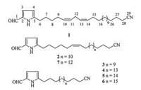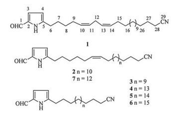 2. Results and discussionFractionation of the Et2O soluble residue of the acetone extract of the title animals by silica gel column chromatography (CC), followed by further silica gel CC and RP-HPLC, led to the isolation of compounds 1-7 (Fig. 1). All these compounds showed very similar spectroscopic properties. Their typical IR absorptions at vmax around 3260, 1645 cm-1, and 1H NMR spectra (a singlet at δ 9.37, a pair of "dd" peak at around δ 6.89 and 6.08, large integration at δ 1.20-1.50) indicated that compounds 1-7 were 5-alkylpyrrole-2-carboxaldehyde derivatives. In addition, their characteristic IR absorption at vmax around 2250 cm-1, 13C NMR datum at δ 119.9, indicated the presence of nitrile functionality. Therefore, compounds 1-7 should be 5-alkylpyrrole-2-carboxaldehyde with a terminal nitrile group. On the basis of the above analysis and by comparing the NMR data with the reported 5-alkylpyrrole-2-carboxaldehyde in the literature, the known isolates were readily identified as mycalenitrile-13 (3) [11], 5-(19'-cyanononadecyl) pyrrole-2-carbaldehyde (4) [7], mycalenitrile-2 (5) [10], mycalenitrile-3 (6) [10], (6'Z)-5-(23'-cyano-6'-tricosenyl)pyrrole-2-carboxaldehyde (7) [9], respectively.