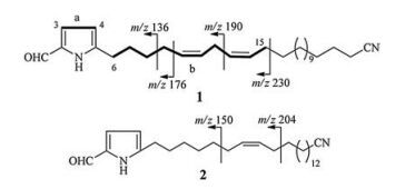 Marine sponge of the genus Mycale (Carmia) is a rich source of bioactive secondary metabolites of diverse structure features, such as peloruside A [1], mycalamides A and B [2, 3]. Pateamine [4], and a series of pyrrole-containing lipids [5-11], with a wide range of biological activities, including antibacterial, antifungal, antiviral, and antitumoral effects. It is worth to mention that even if pyrrole is a structurally simple five-membered ring, pyrrole-containing lipids have seldom been discovered in the marine organisms, with distribution limited primarily to specific species of algae, sponges, bryozoans, tunicates and mollusks [12]. Among these marine sources, sponges of the Mycale genus have been recognized as one of the main origins of pyrrole-containing lipids. In the last decades, a variety of new 5-alkylpyrrole-2-carbaldehydes have been isolated from this genus of sponges and some of them were found to be of strong antidiabetic and antitumoral activities [8, 10, 11]. In our continuous searching for biologically active secondary metabolites from Chinese marine sponges [13-15], M. lissochela was collected from Lingshui, Hainan, China. The chemical investigation of its acetone extract resulted in the discovery of two new, namely mycalenitrile-15 (1) and mycalenitrile-16 (2), and five known 5-alkylpyrrole-2-carboxaldehyde derivatives (3-7). Herein, we report their isolation, structure determination and PTP1B inhibitory activities.