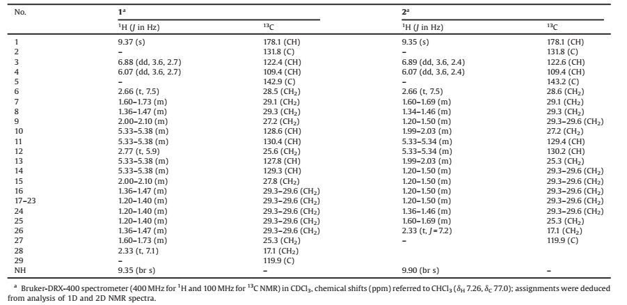 Compound 1 was obtained as an optically inactive white amorphous powder, and its molecular formula, C29H46N2O, was established from HR-EIMS with the ion peak at m/z 438.3621 (calcd. for C29H46N2O: 438.3611). Its 1H NMR spectrum not only comprised an aldehyde proton signal at δH 9.37 (s, 1H, H-1), two pyrrole proton signals at δH 6.87-6.89 (dd, 1H, J = 3.6, 2.7 Hz, H-3) and 6.06-6.08 (dd, 1H, J = 3.6, 2.7 Hz, H-4), a broad NH signal at δH 9.35 (1H, brs), but also four olefinic proton signals at δH 5.33-5.38 (m, 4H, H-10, H-11, H-13, and H-14), and signals at δH 2.66 (t, 2HJ = 7.5 Hz, H-6), 2.33 (t, 2H, J = 7.2 Hz, H-28), and 2.00-2.10 (m, 4H, H-9 and H-15). The 13C NMR data confirmed the presence of the aldehyde [δC 178.1 (d, C-1)], pyrrole carbons [δC 142.9, 131.8 (s, C-2), 122.4 (d, C-3), 109.4 (d, C-4)], olefin [δC 130.4 (d, C-11), 129.3 (d, C-14), 128.6 (d, C-10), 127.8 (d, C-13)], and a nitrile carbon [δC 119.9 (s, C-29)] (Table 1). By comparing with the NMR data with those reported for the co-isolated known compounds 3-7, 1 was suggested to be a 5-alkylpyrrole-2-carboxaldehyde derivative with a long unsaturated aliphatic side chain at the C-5 position. Furthermore, the triplet of CH2-12 at δ 2.77 (t-J = 5.9 Hz) and δC 25.6 (C-12), and its strong 1H-1H COSY correlation (Fig. 2) with the olefinic protons, inferred that the two double bonds were separated by the methylene-12. The presence of allylic carbon signals at δC 27.2 (C-9), 27.7 (C-12) and 27.8 (C-15), with no signals in the range 31-35 ppm, indicated that both two olefinic bonds encompassed Z geometry [5, 9]. The position of the two olefinic bonds was determined from interpretation of the COSY spectrum, leading to the spin-spin system b (C-6 to C-15) (Fig. 2). Such connection was confirmed by the EI-MS analysis (Fig. 2) with the specific signals at m/z 136, 176, 190, and 230, resulted from CH2 or allylic cleavage of the side chain [5, 9]. In view of the molecular formula of C29H46N2O, the linkage of the terminal nitrile was determined, and thus compound 1 was characterized as presented in Fig. 1, namely mycalenitrile-15.